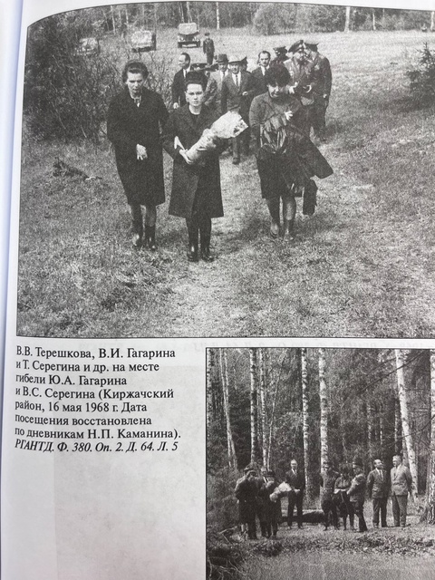 Фотография Валентины Гагариной во время ее первого приезда на место гибели мужа. Под руку вдову первого космонавта поддерживает первая женщина-космонавт Валентина Терешкова. Рядом идет жена погибшего вместе с Гагариным летчика Владимира Серегина.