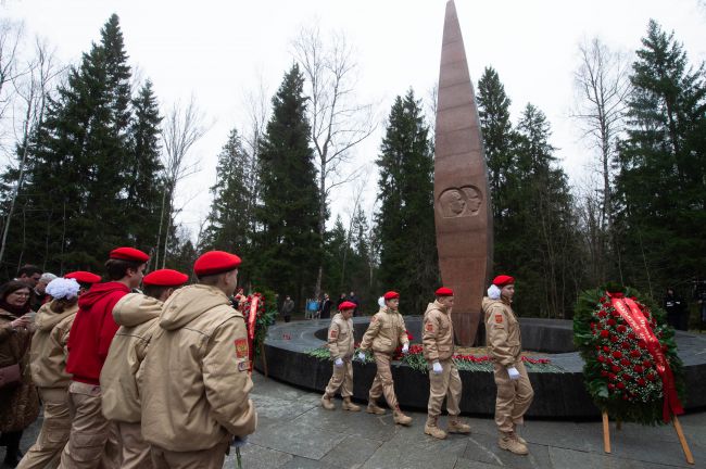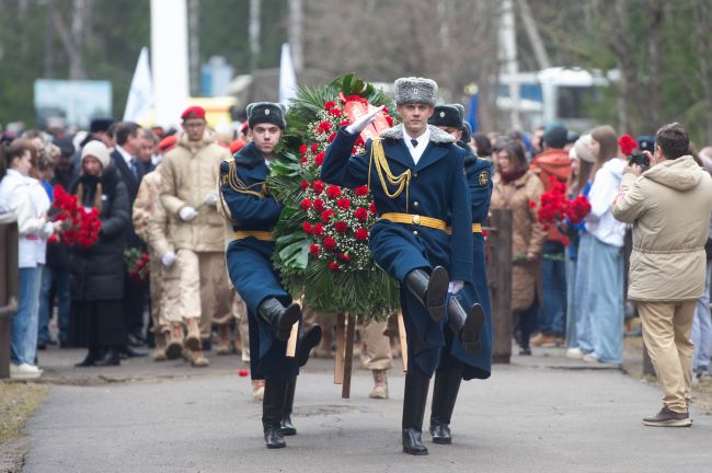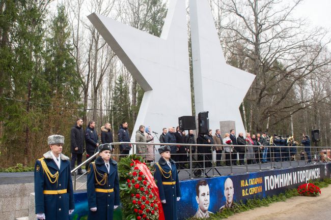 Все собравшиеся прошли к стеле на месте разбившегося самолёта, где возложили цветы в память о первом космонавте планеты и его лётном наставнике, участнике Великой Отечественной войны.