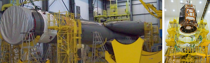 The basic Soyuz launcher is shown with its installed Block I third stage inside the Spaceport's MIK integration building (photo at left),
