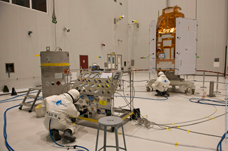 Вертикализацию «Союза-СТ» в мобильной башне обслуживания (МБО) специалисты должны завершить сегодня вечером. За этим последует стыковка коммуникаций «пакета», сборка схем термостатирования, стыковка заправочных коммуникаций и другие операции, предусмотренные графиком подготовки.