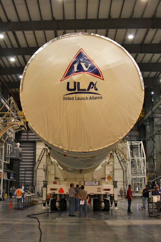 Already tucked inside the rocket's five-meter-diameter, 47-foot-tall nose cone, a process that was accomplished before the holidays while still at the spacecraft preparation facility in Titusville, WGS 4 was driven on a specialized transporter across the river, through Kennedy Space Center and over to Complex 37 in the frigid predawn darkness Wednesday.