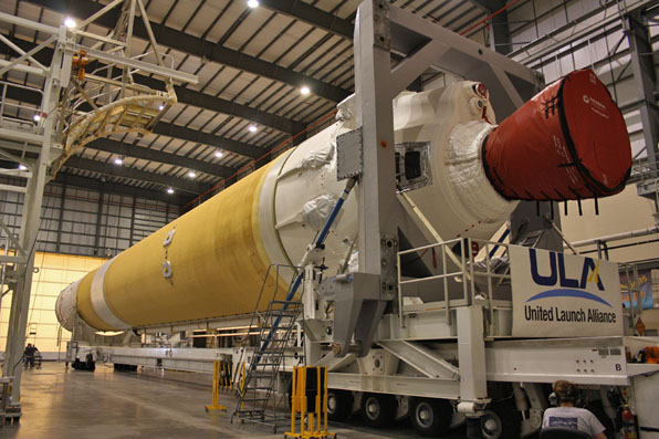 Initial assembly of the rocket, including mating of the cryogenic upper stage with the Common Booster Core first stage using a precision laser alignment system, was completed in the Horizontal Integration Facility. Technicians will finish putting the vehicle together at the launch pad by installing the four strap-on solid rocket boosters and attaching the satellite payload.