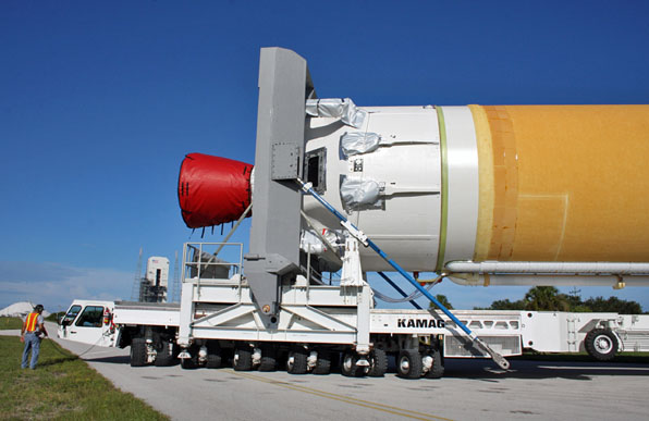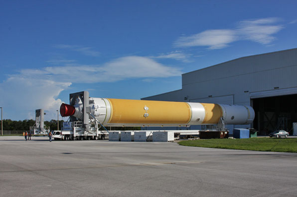 Initial assembly of the rocket, including mating of the cryogenic upper stage with the Common Booster Core first stage using a precision laser alignment system, had been completed inside the Horizontal Integration Facility over the past couple of months.