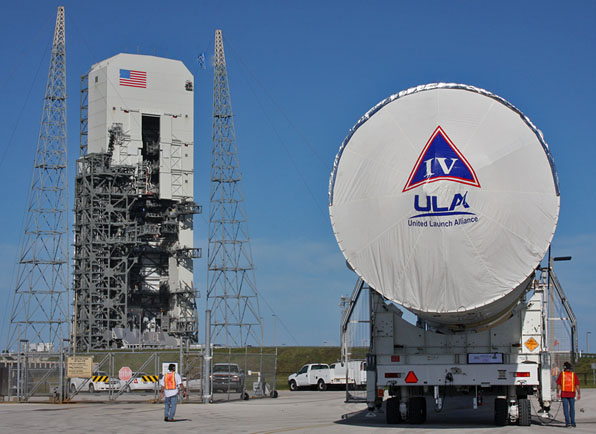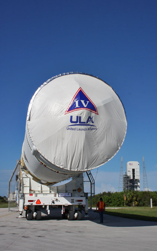 A United Launch Alliance Delta 4 rocket is standing atop the Complex 37 pad awaiting the satellite's arrival. The booster was rolled out Oct. 10 to start its own pre-flight checkout sequence.