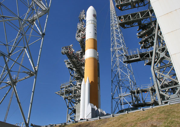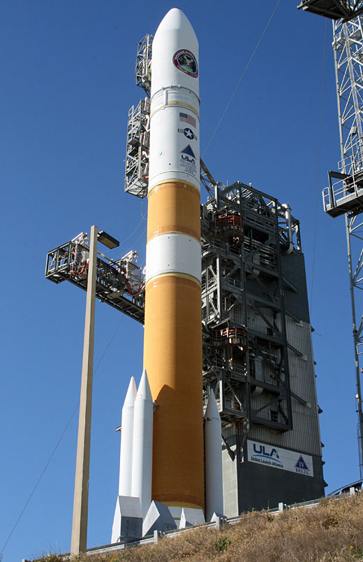 United Launch Alliance says the 218-foot Delta IV, in a medium configuration with four strap-on solid rocket motors, is ready for launch.