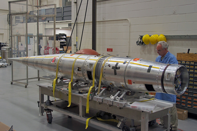 The IRVE-3 experiment will fly aboard a three-stage Black Brant XI launch vehicle for its suborbital flight. The payload and the heat shield, which looks like a large, uninflated cone of inner tubes, will be packed inside the rocket's 22-inch-diameter nose cone. About six minutes after launch, the rocket will climb to an altitude of about 280 miles over the Atlantic Ocean.