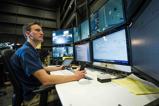 With the cameras on the robot to guide him and supported by innovative software, Janas uses a joystick and keyboard to mate the robot's tool to the satellite valve so the oxidizer transfer can take place.
