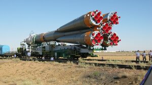 Российскую ракету-носитель "Союз" с пилотируемым кораблем установили сегодня утром на первой - Гагаринской - стартовой площадке Байконура.