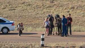 За вывозом 50-метровой "сигары" с эмблемами Роскосмоса, Ракетно-космической корпорации "Энергия" и флагами России, США и Японии на обтекателе наблюдали десятки журналистов, специалистов космической отрасли, иностранных туристов, VIP-гостей.