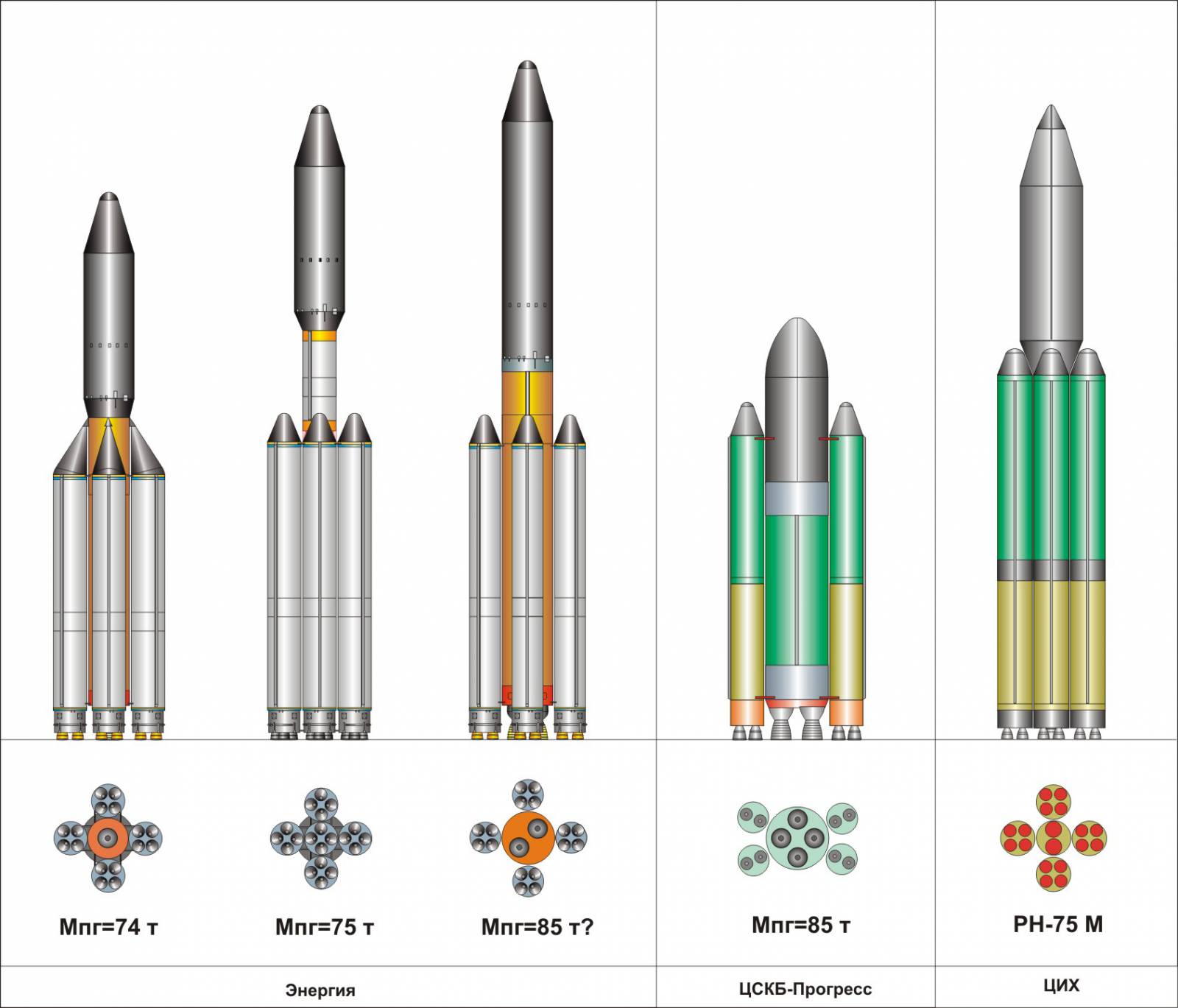линейка сверхтяжей 75-85 т от конкурирующих п-я. Раскраска условная  ;)  Зелёный - метановые, коричневый - водород, серый - керосин