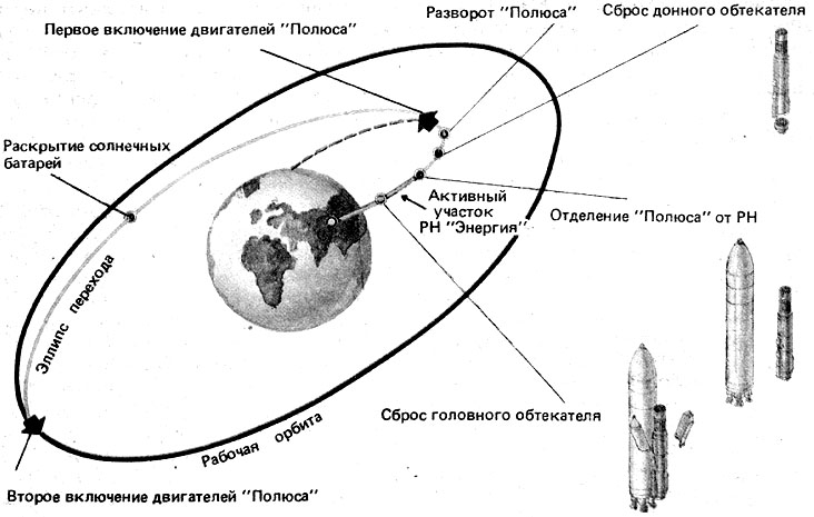 Параметры рабочей орбиты – высота 300 км, наклонение 65° позволяют обеспечить схему полета, показанную в <...>. На активном участке траектории через 147 сек после старта происходит отделение блоков первой ступени. На 225 секунде сбрасывается головной обтекатель блока второй ступени, на 458 секунде прооисходит отделение блока второй ступени от космического аппарата. Затем включается двигатель доразгона космического аппарата и он переходит на рабочую орбиту.