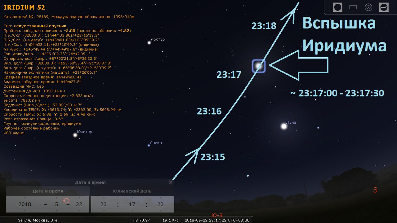 В 23:17:00 - 23:17:30 можно наблюдать яркую вспышку Иридиума (солнечный блик от антенн). На несколько секунд спутник Иридиум станет самой яркой звездой на небе.
