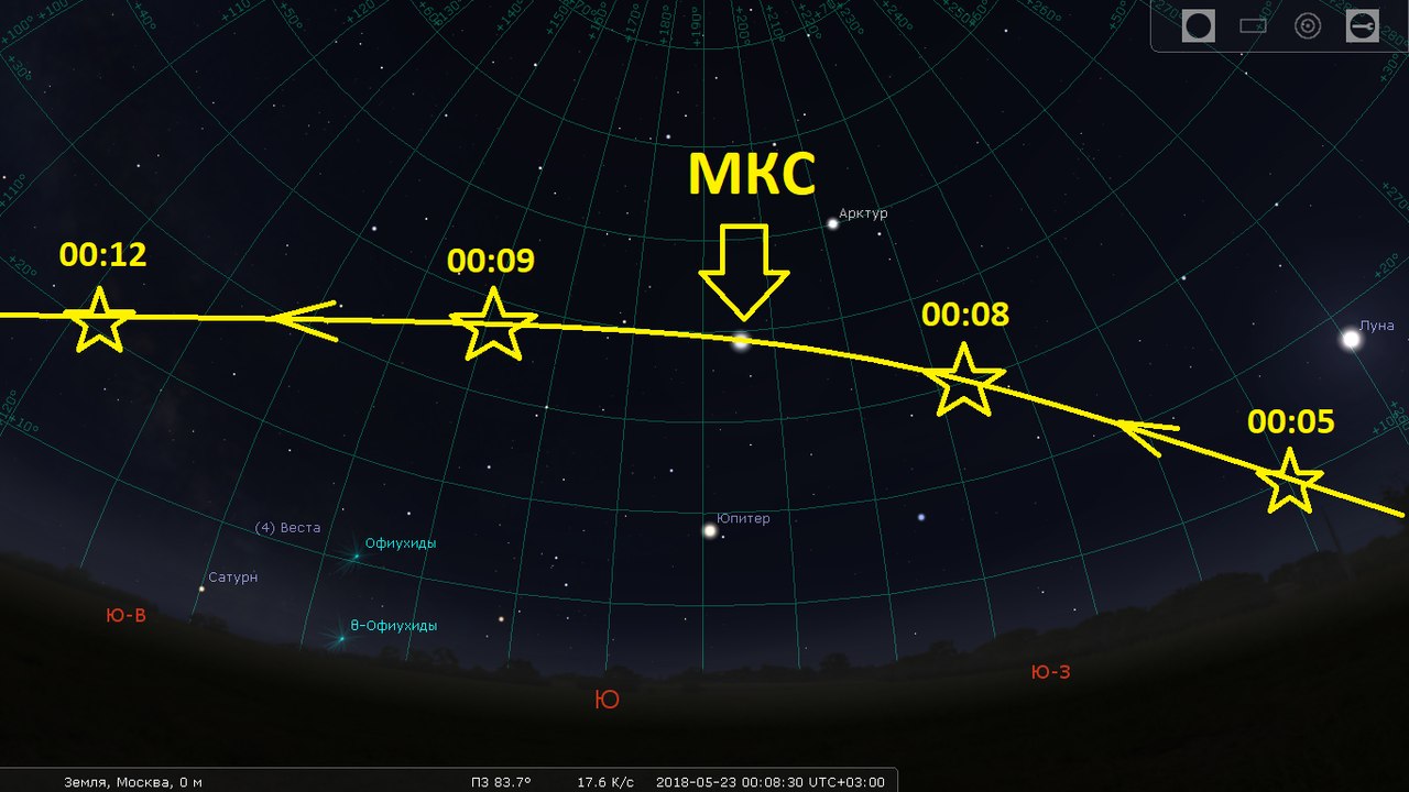 Станцию будет видно в виде яркой звездочки, движущейся с юго-запада на юго-восток в течение нескольких минут.