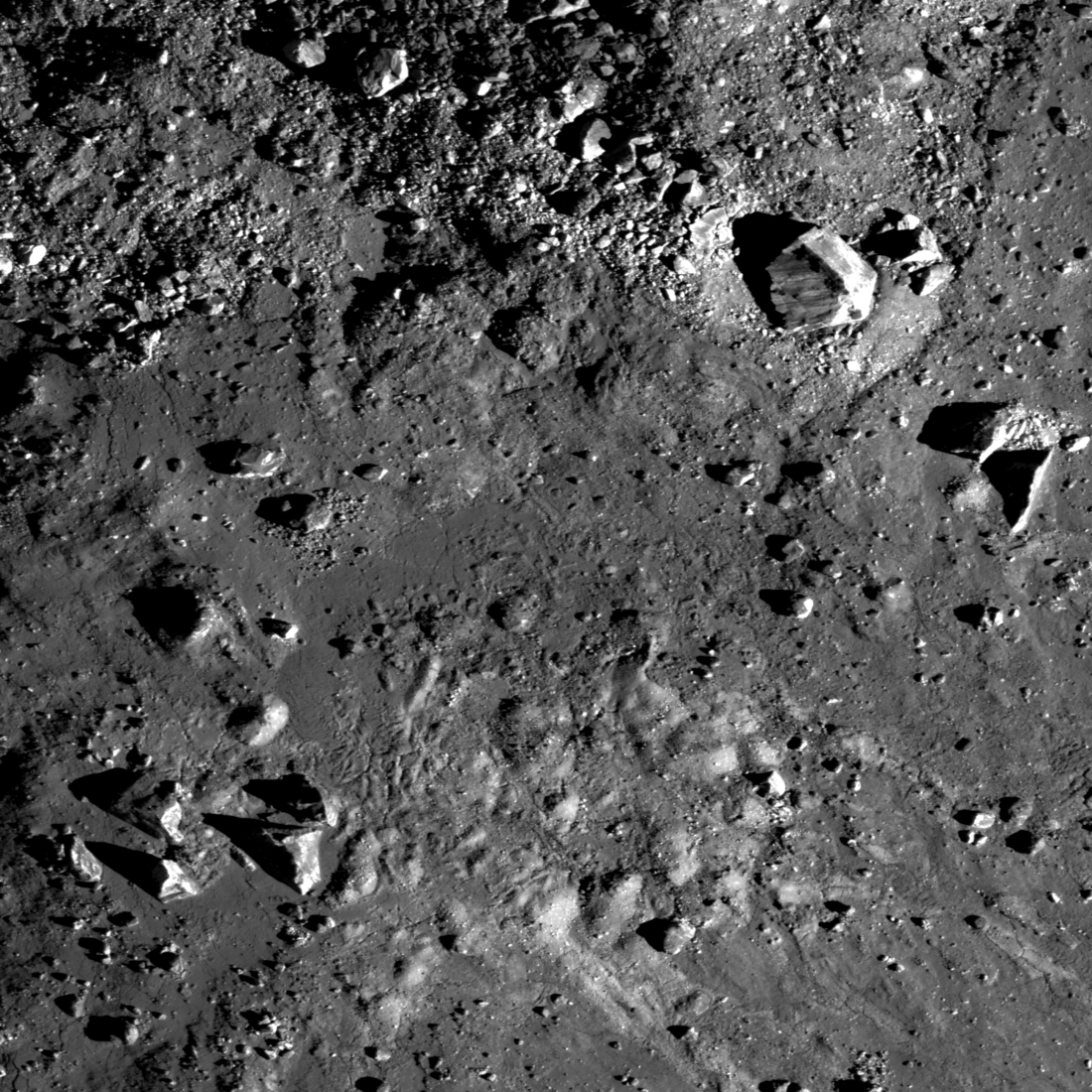 Полная версия начального изображения с фокусом на огромных блоках, разбросанных по полу. Вырезано из M1452055478LR, ширина изображения 1300 метров [NASA/GSFC/Университет штата Аризона/Intuitive Machines