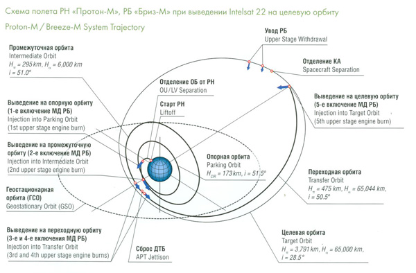 Особенность запуска КА Intelsat -22 состоит в том, что в качестве целевой орбиты  была выбрана суперсинхронная геопереходная орбита с наибольшей высотой 65 тыс. километров. При использовании стандартной схемы выведения «Протон» доставляет зарубежные спутники на геопереходную орбиту высотой 35-37 тыс.