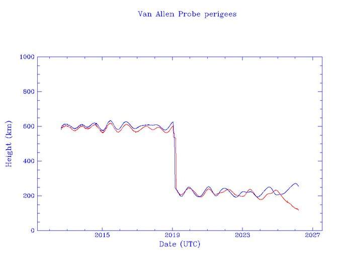 In February, the spacecraft were placed in a lower orbit that will eventually decay, letting the twin Van Allen Probes reenter and burn up in Earth's atmosphere.