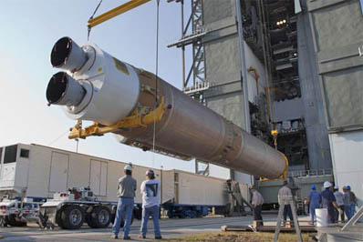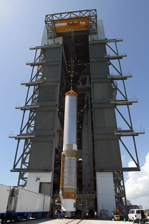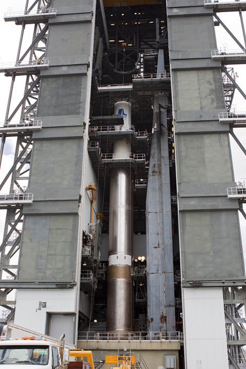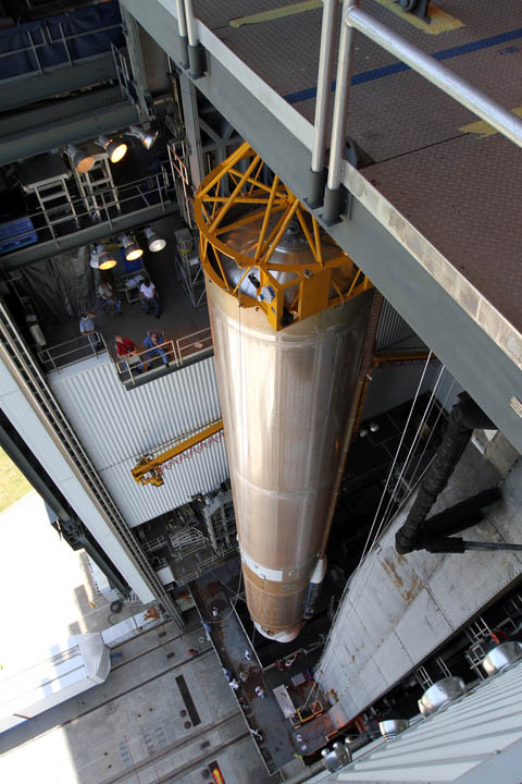 At the Vertical Integration Facility adjacent to Cape Canaveral's Complex 41 launch pad, technicians hoisted the giant first stage onto the mobile launching platform as the stacking operations got underway to assemble the vehicle for its planned Aug. 23 blastoff with NASA's Radiation Belt Storm Probes mission.