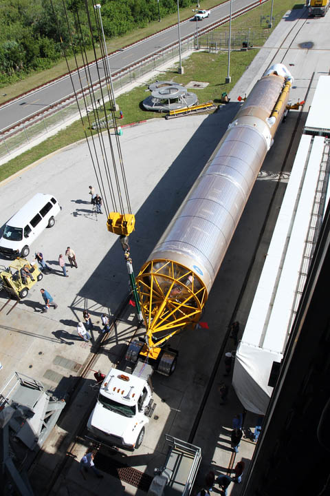 Friday's operation featured the first stage, known as the Common Core Booster, being rotated vertical, maneuvered into the 30-story VIF building and then the 106.6-foot-long stage stood upright on the mobile platform.