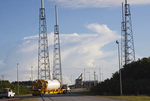 It is the most-basic 401 version of the Atlas 5, possessing a four-meter-wide payload shroud, no strap-on solid boosters and a single-engine Centaur. The Radiation Belt Storm Probes will be encapsulated within the rocket's nose cone at their processing facility in the coming days before the cargo is trucked to the rocket hangar for mating next month.