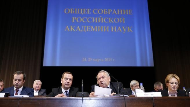 В.Фортов: Уважаемый Дмитрий Анатольевич, я и все мои коллеги очень рады приветствовать Вас здесь, в стенах Российской академии наук. Для нас очень важно, что Вы нашли время приехать на наше общее собрание...