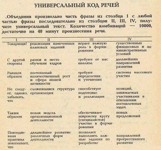 Наверное, некоторые из вас слышали об "универсальном коде речей". Мне этот универсальный код речей несколько лет назад принес мой близкий человек. Использовался он, якобы, во времена СССР для нужд Партии, чтобы легче было готовить речи для всяких депутатов. Что ж, вполне возможно. Вкратце, это такая табличка на которой в определенном порядке написаны штампованные фразы. Если говорить их по этой табличке следуя указанному порядку, можно трепаться на каком-нибудь партсобрании очень и очень долго, при этом гладко, красиво и с важным смыслом. Если хотите подробнее, гугл в помощь.