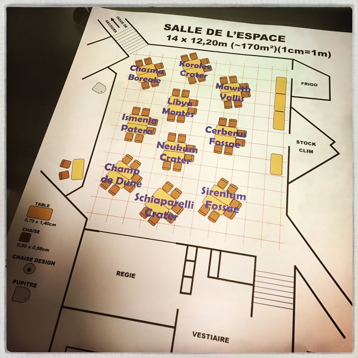 Réunion aujourd'hui de toute la communauté française impliquée dans la mission @ESA_ExoMars au @CNES. Regardez le nom des tables, nous sommes presque déjà sur Mars !