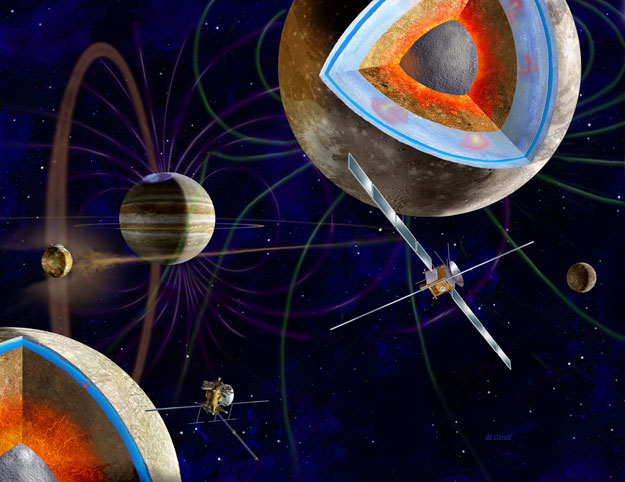 Artist's impression of the Europa Jupiter System Mission which the European Space Agency might undertake with Russia and Japan after NASA funding became in doubt. NASA/ESA/Artist Michael Carroll