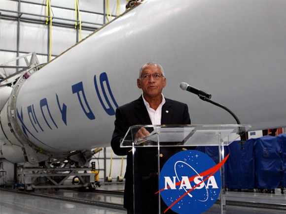 NASA Administrator Charles Bolden addresses the media at SpaceX's main hangar in Cape Canaveral, FL. The sequester will affect both NASA and SpaceX. Credit: NASA.