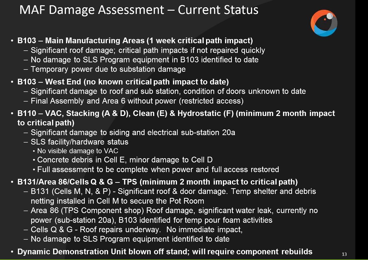 Hill shows this figure of the tornado damage to Michoud in February affecting SLS work: