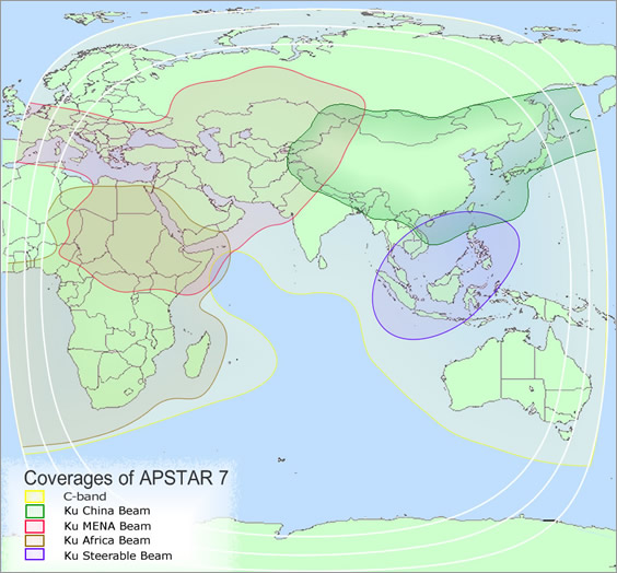APSTAR-7 satellite's C-band global beam covers Asia, Africa, Australia and part of Europe and its multiple Ku-band beams, including China Beam, Middle East & North Africa Beam, Africa Beam and a Steerable Spot Beam are able to provide in-beam and cross-beam broadcast and telecommunication services.