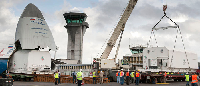 The JCSAT-13 shipping container is positioned on a flatbed truck (at right) as the other container with VINASAT-2 emerges from their An-124 cargo aircraft at Cayenne's Rochambeau International Airport.