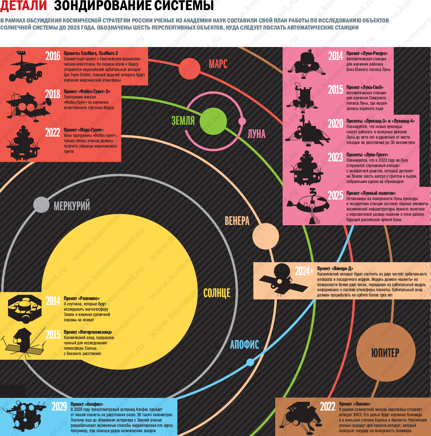 Зато в предложениях от Российской академии наук четко прописаны те пряники, которые получит российская наука от Роскосмоса, если, конечно, все пойдет по плану. Самый главный пункт: количество запусков по фундаментальным космическим исследованиям должно составить до трех в год, тогда как в 2006-2011 годах производился один "научный" запуск в два года. Планов — громадье. В частности, на первом этапе, который начнется в 2014-2015 годах, спутник Земли станут исследовать зонды "Луна-Ресурс" и "Луна-Глоб". Далее на наш искусственный спутник будут десантированы новые луноходы — "Луноход-3" и "Луноход-4", которые возле полюса соберут капсулы с лунным льдом и отправят их на Землю. Не мене важное место в программе занимает исследование Солнца - планируется запустить четыре спутника-близнеца "Резонанс", которые будут исследовать магнитосферу Земли и влияние солнечной плазмы на климат. Другой проект по изучению солнечно-земных связей — "Интергелиозонд", который будет исследовать гелиосферу и влияние солнечных циклов активности на дела земные. Разумеется, не забыты и исследования Юпитера, астероидов и все того же Фобоса, ставшего символом позора нынешней космонавтики, все руководители отрасли считают делом чести повторить попытку получить драгоценный грунт с этой каменюки.