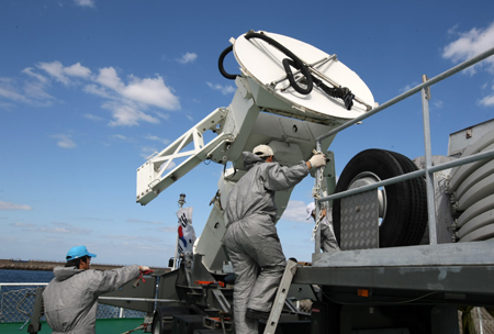 Корейский институт аэрокосмических исследований ученые проверки мобильного устройства телеметрии на судне вблизи Остров Чеджу на 11 октября, который будет использоваться для приема радиосигналов из космоса Кореей ракеты-носителя (KSLV-1), когда он запускает. / Yonhap