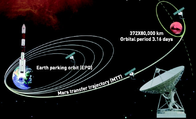 The orbiter will be in the earth's orbit for 25 days after launch and fired the next day, to set off on a nine-month voyage to reach Martian orbit by Sep 21, 2014.
