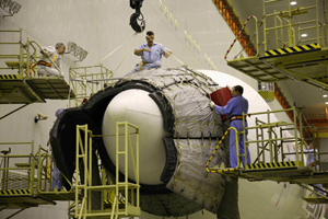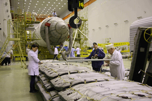 В минувшие выходные в сооружении МИК 92 –А50 российские и иностранные специалисты выполнили механическую стыковку космической головной части c ракетой «Протон-М», провели необходимые электрические проверки и установили на головную часть ракеты космического назначения защитный термочехол.