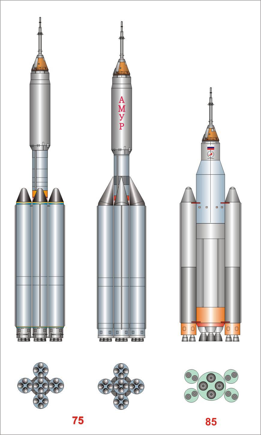 Могу ошибиться в количестве двигателей на блоке Ц. В презентациях от Энергии указывалось от 2-х до 3-х. Интересно отметить, что Енисей от ЦиХ тоже имеет 3 дв-ля на бл. Ц. То есть 130 тонники от Энергии и Цих идентичны.  ;)  Более того, идентичны и 75 тонник от Энергии и "Амур" от ЦиХ! Только "Амур" имеет 3-ю водородную ступень. Но для 75 т она переразмерена и её заменят ИМХО на керосиновую. Да с, поломает голову конкурсная комиссия, когда будет выбирать между Энергией и ЦиХ одинаковые девайсы. Всё будет зависеть от красоты представленных рисунков и полноты налитого стакана