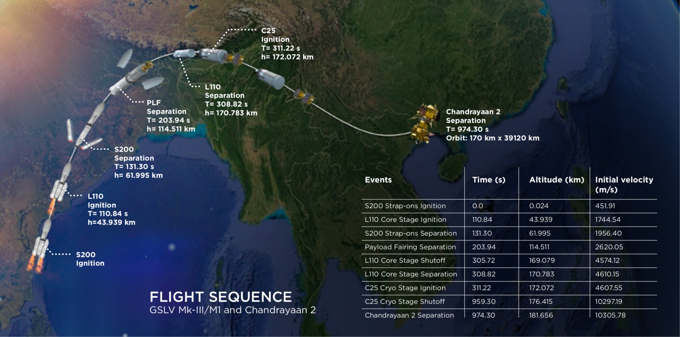 Separation of the Chandrayaan 2 spacecraft from the GSLV Mk.3's upper stage is scheduled for T+plus 16 minutes, 14 seconds.