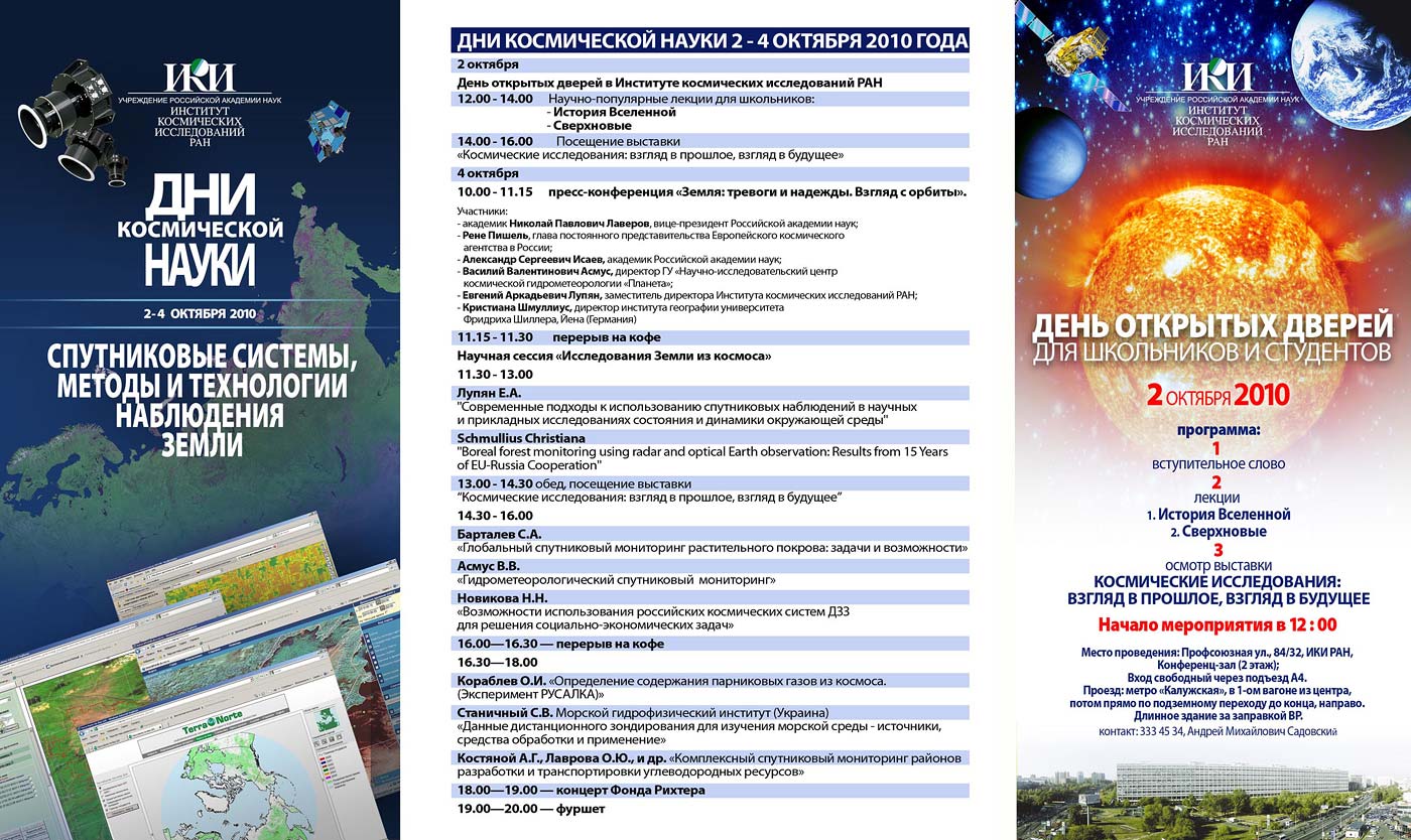 Приглашаем Вас принять участие в мероприятиях Дней космической науки, которые пройдут в Институте космических исследований РАН 2—4 октября 2010 года. Главная тема обсуждения – исследования Земли из космоса и использование спутниковых данных для решения «земных» проблем.