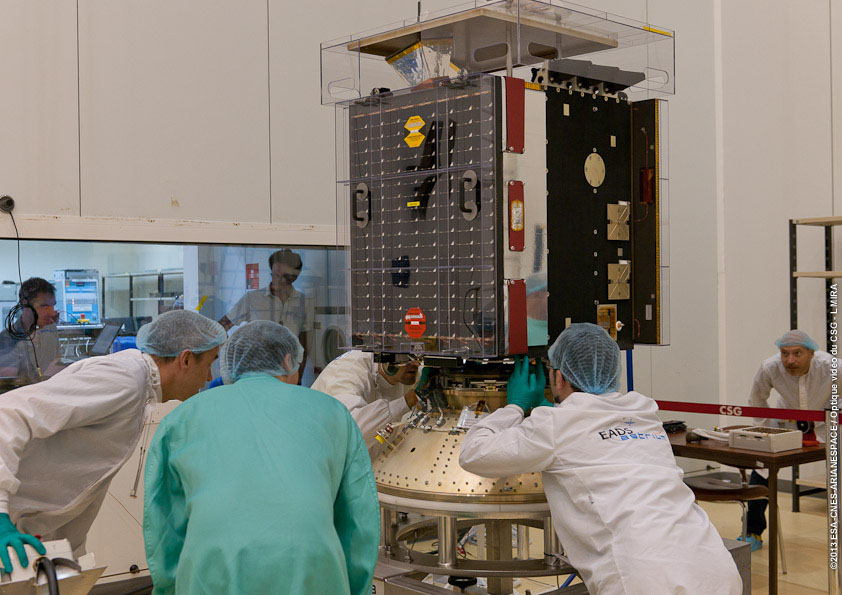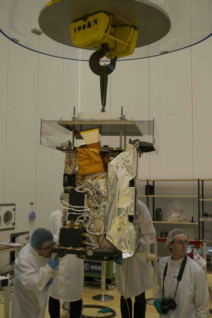 Proba-V is readied to be integrated in the payload "stack" for Vega's second launch from the Spaceport in French Guiana, which also will orbit the VNREDSat-1 and the ESTCube-1 satellites.