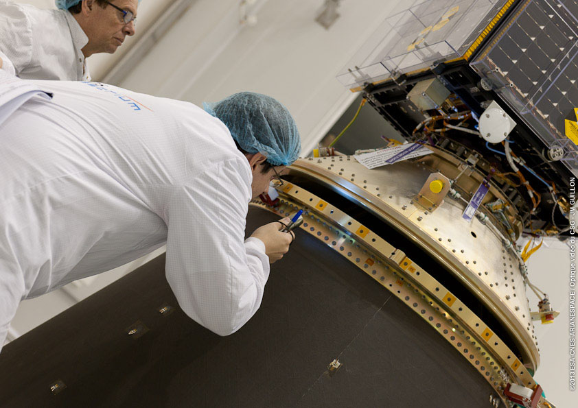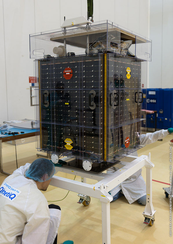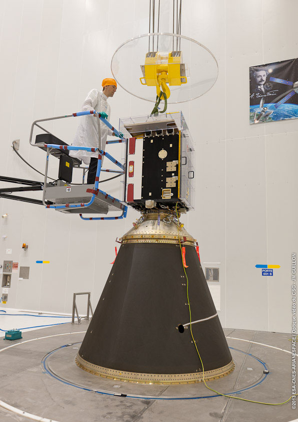 Both satellites are located in the payload stack's lower position, and will ride inside a larger dispenser system called VESPA.  Completing the payload arrangement will be installation of the mission's third satellite – Proba-V – which is to ride atop the VESPA dispenser.