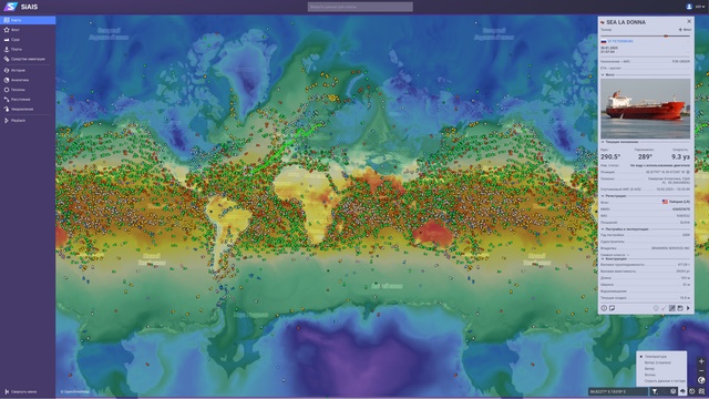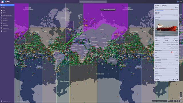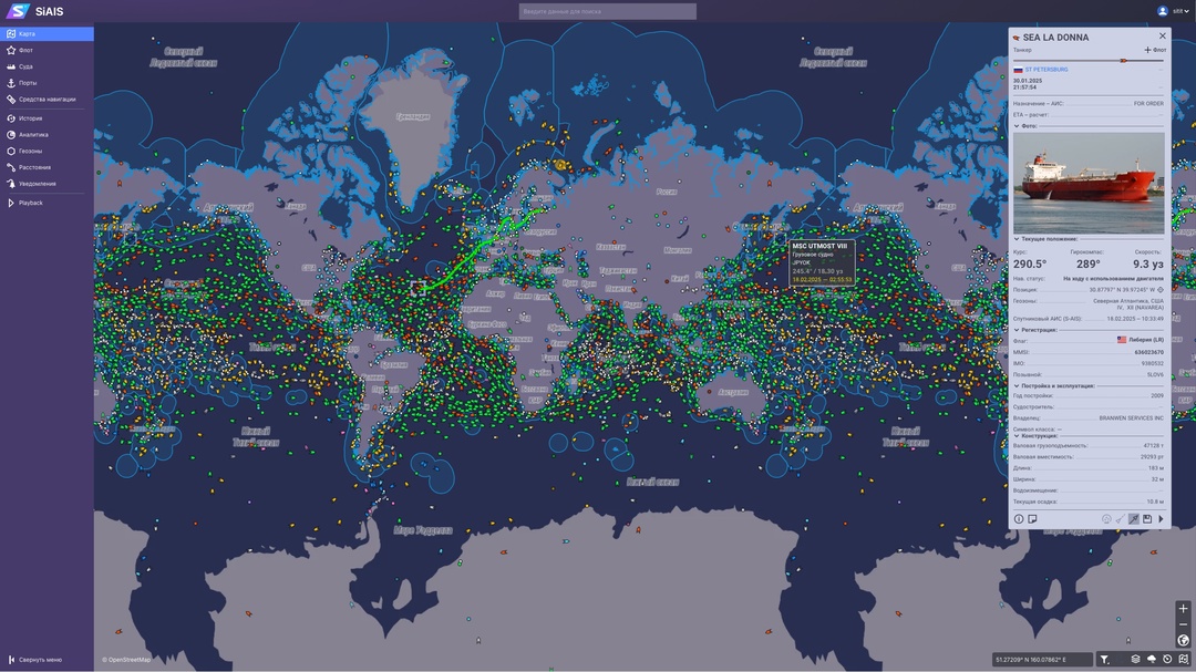 Сервис SiAIS показывает информацию обо всех портах мира и более чем 500 тысячах судов, находящихся в Мировом океане и на внутренних водных путях, используя независимые данные от российской спутниковой группировки.