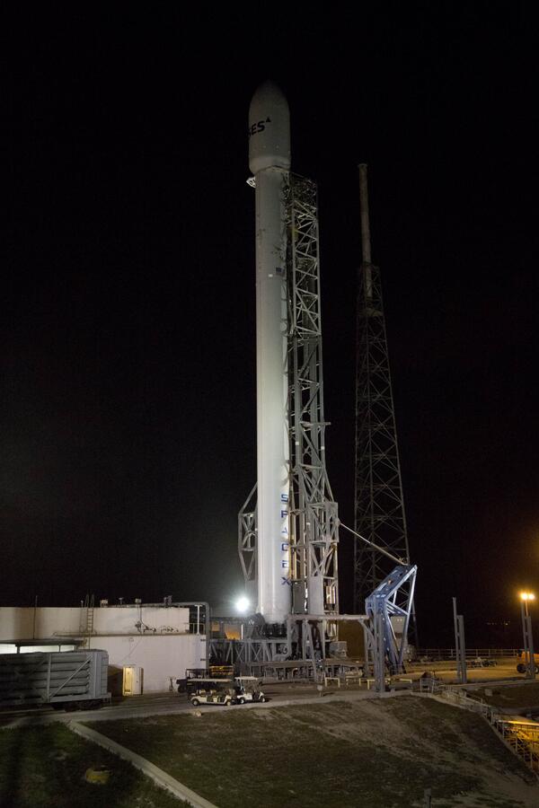 SpaceX technicians rolled the Falcon 9 rocket out of its hangar and mounted the booster and its transporter-erector atop Cape Canaveral's Complex 40 launch pad overnight, plugging into electrical and propellant lines ahead of the start of the countdown today.