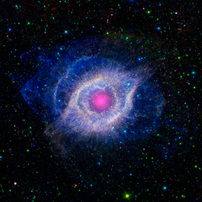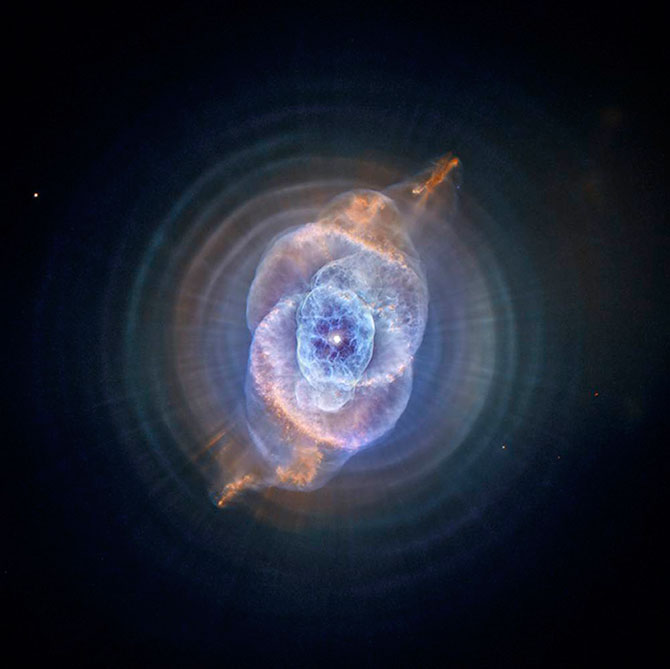 Ретроспектива событий, происходивших с нашим Солнцем. В роли будущего светила, планетарная туманность Кошачий глаз, которая переживает то же самое, что и Солнце миллиарды лет тому назад.