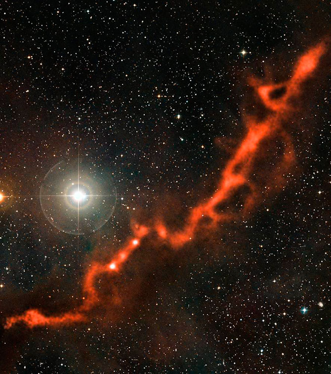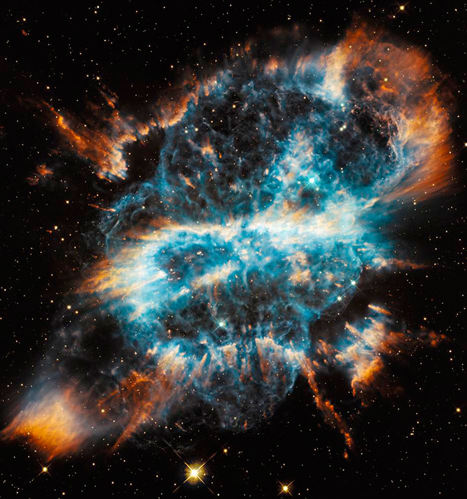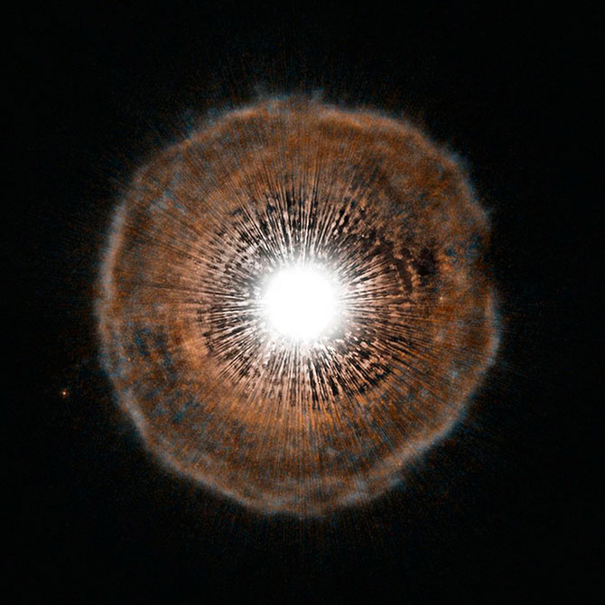 Одна из звезд в созвездии Жирафа, приближается к своей смерти. Очередной выброс газа и последующее свечение остатков гелия удалось заснять телескопу «Хаббл».