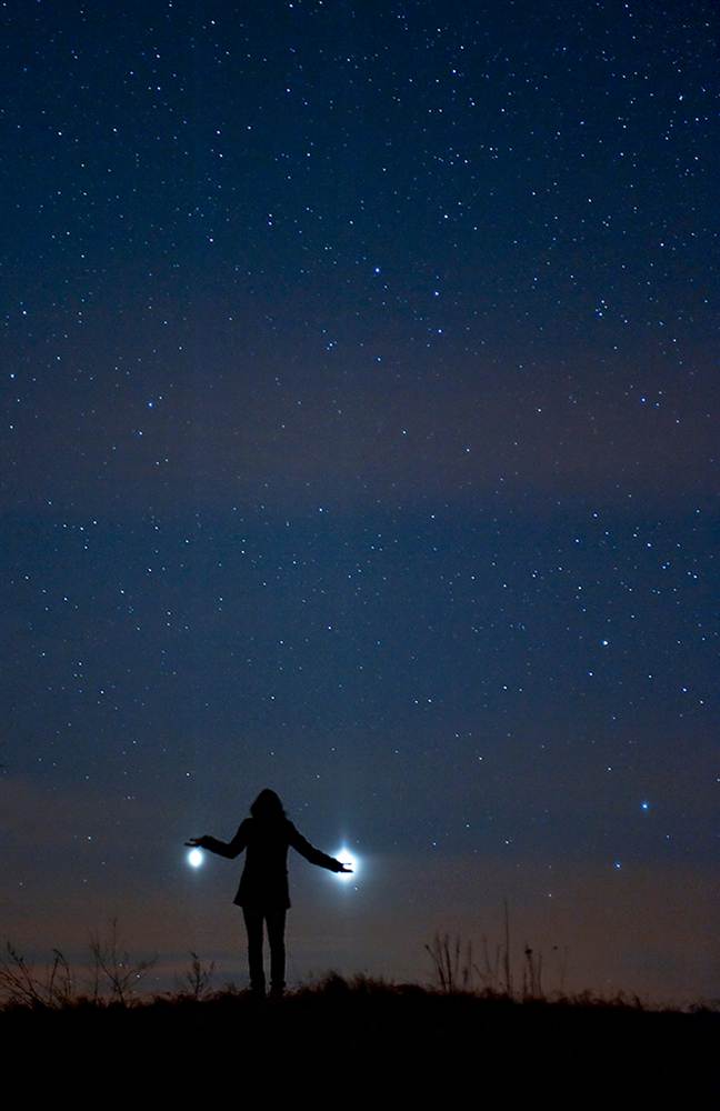 Фото «Небесные фонарики», Марека Никодема, демонстрирует еще одно необычное явление – Венера (в правой руке) и Юпитер (в левой руке) совсем рядом.