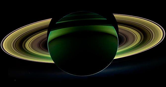Снимок Сатурна и его колец, сделанный аппаратом «Cassini», с использованием инфракрасного, красного и фиолетового фильтров. В нижнем левом углу мерцают два спутника планеты – Энцелад и Тетис.