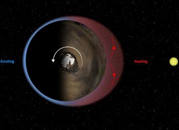 During this thermal tide process, sunlight heats the surface and atmosphere on the day side of the planet, causing air to expand upwards. At higher levels in the atmosphere, this bulge of air then expands outward, to the sides, in order to equalize the pressure around it.
