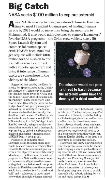 Members of the Keck team that drafted the proposal briefed it to a National Research Council human-spaceflight technical feasibility panel on March 28, noting that the mission would not pose a threat to Earth because the asteroid would have the density of "a dried mudball," and would come in much more slowly than the slightly larger asteroid that exploded over Chelyabinsk, Russia, in February.