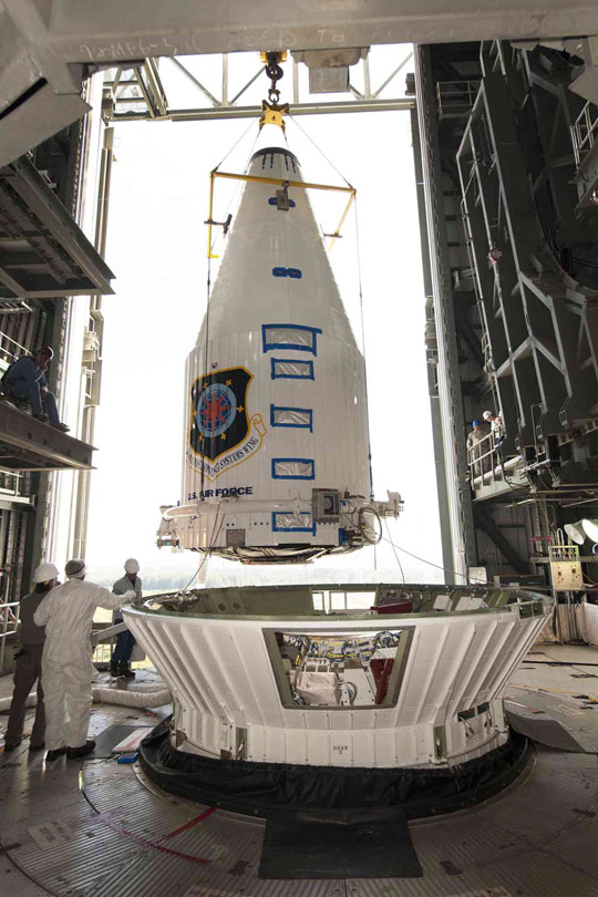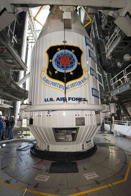 The Global Positioning System 2F-4 navigation satellite, already enclosed in the launch vehicle's aluminum nose cone, is hoisted atop the United Launch Alliance Atlas 5 rocket in the Vertical Integration Facility on May 6.
