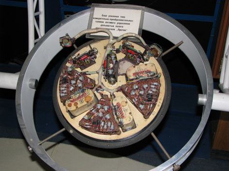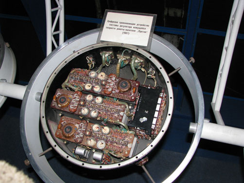 Прибор системы автомата управления выключением двигателей ракеты "Протон", выдающий команды от электролитических интегрирующих элементов при достижении заданной скорости